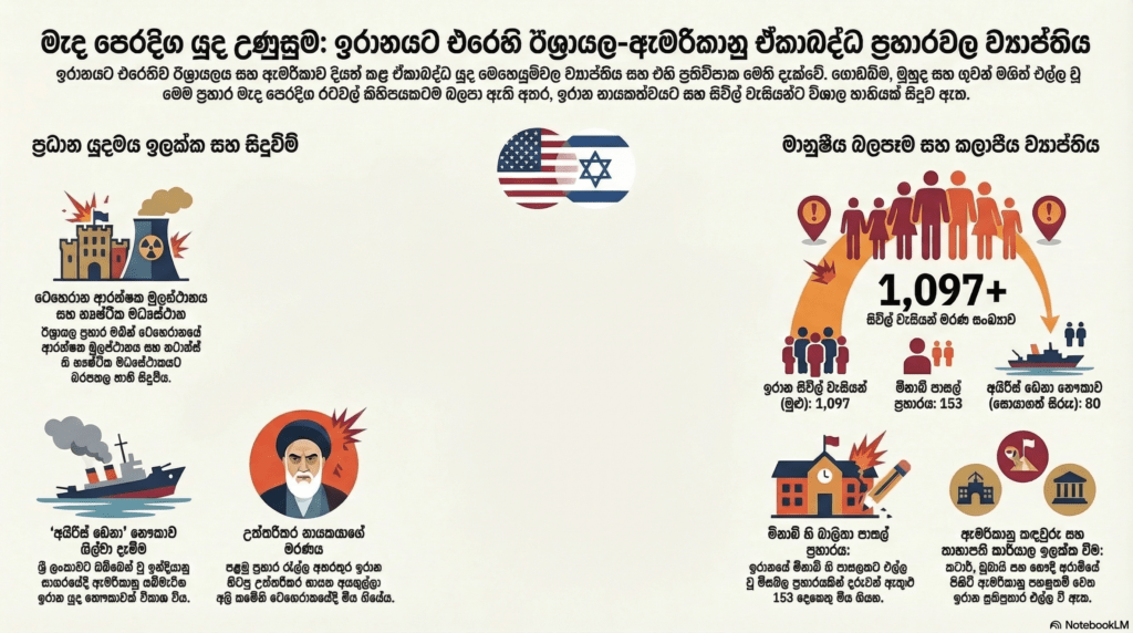 බටහිර සහ මධ්යම ඉරානයේ සහ අගනුවර වන ටෙහෙරානයේ ගුවන් ආරක්ෂක විනාශ කරමින් ඊශ්රායල හමුදාව සෙනසුරාදා එක්සත් ජනපදය සමඟ පුළුල් ඒකාබද්ධ ප්රහාර නිවේදනය කළේය. පළමු ප්රහාර රැල්ල අතරතුර හිටපු උත්තරීතර නායක අයතුල්ලා අලි කමේනි ටෙහෙරානයේදී මිය ගියේය.