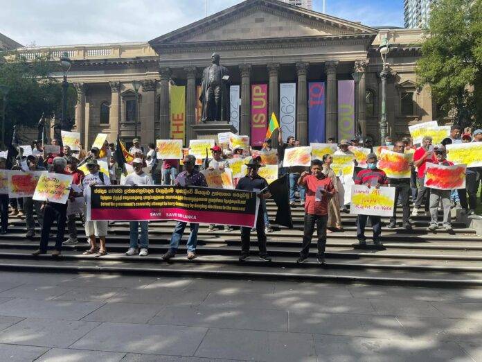 පළාත් පාලන මැතිවරණය පවත්වන ලෙසට රජයට බල කරමින් විදෙස් රටවල ජීවත්වන ශ්රී ලාංකිකයින් පිරිසක් ඊයේ (05)දිනයේදී විරෝධතාවයන් පවත්වනු ලැබූ අතර, නවසීලන්තය, ඔස්ට්රේලියාව, ඉතාලිය ඇතුළු රටවල ජාතික ජන බලවේගය පක්ෂයට සහය දක්වන ලාංකිකයින් විසින් මෙම විරෝධතාවන් සංවිධානය කර තිබුණා.
