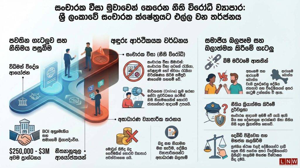 මාර්තු 18, කොළඹ (LNW): ශ්රී ලංකාවේ සංචාරක කර්මාන්තය නැවත නැඟී සිටීම බොහෝවිට ආර්ථික ජයග්රහණයක් ලෙස ඉදිරිපත් කළත් එම පැහැදිලි ප්රතිරූපයට යට වුන තවත් බරපතළ ගැටලුවක් ඉදිරියට නිර්මාණය වෙමින් පවතී. ඒ සංචාරකයන්ගේ පුරප්පාඩුව නම් නොව සංචාරක වීසා යටතේ පැමිණෙන විදේශිකයන් විසින් නීති උල්ලංඝනය කරමින් ව්යාපාර පවත්වාගෙන යාම සහ ඒවා පැහැදිලිව පෙනෙන පරිදි සමෘද්ධිමත් වීමට ඉඩ සලසන බලධාරින්ගේ පැහැදිලි අසාර්ථකත්වය වේ.