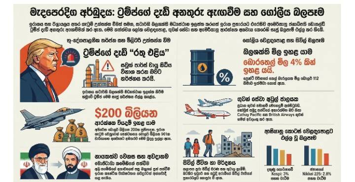 - ගෝලීය වෙළඳපොළ: දකුණු කොරියාවේ Kospi දර්ශකය 3% කින් ද, ජපානයේ Nikkei 225 දර්ශකය 2.8% කින් ද පහත වැටී ඇති අතර එය ආසියානු ආර්ථිකයට දැඩි බලපෑමක් එල්ල කර ඇත.