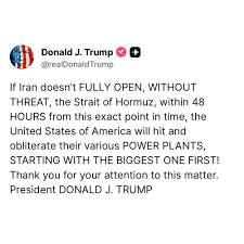 “මෙම නිශ්චිත මොහොතේ සිට පැය 48ක් ඇතුළත ඉරානය හෝමූස් සමුද්ර සන්ධිය සම්පූර්ණයෙන්ම විවෘත නොකළහොත්, ඇමරිකා එක්සත් ජනපදය ඔවුන්ගේ විවිධ බලාගාරවලට පහර දී විනාශ කරනු ඇත, පළමුව විශාලතම එකකින් ආරම්භ වේ! මේ කාරණය කෙරෙහි ඔබේ අවධානයට ස්තූතියි.”
