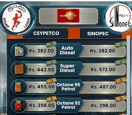 මේ අනුව, සිනොපෙක් සමාගම විසින් සුපිරි ඩීසල් සහ සුපිරි පැට්රෝල් (95) මිල ගණන් සිපෙට්කෝ මිලට සාපේක්ෂව සැලකිය යුතු මට්ටමකින් ඉහළ දමා තිබෙනවා. එහෙත්, සාමාන්ය ඩීසල් සහ පැට්රෝල් වල මිල තීරණය කිරීම සඳහා ඔවුන්ට එවැනි අවසරයක් ලැබී ඇති බවක් පෙනෙන්නට නැහැ.