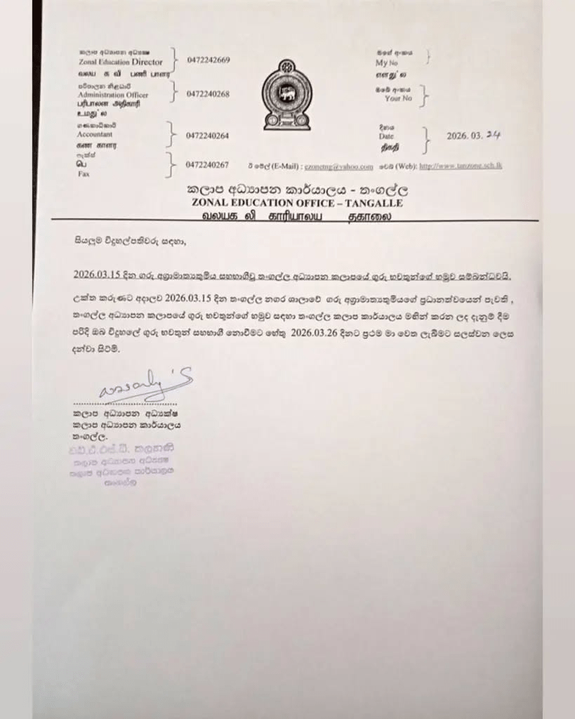 තංගල්ල කලාප අධ්යාපන අධ්යක්ෂවරිය විසින් මාර්තු 24 දිනයේදී සියලු විදුහල්පතිවරුන් වෙත ලිපියක් යොමු කරමින් සඳහන් කර ඇත්තේ අදාළ හමුවට සහභාගී නොවීම සම්බන්ධයෙන් මාර්තු මස 26 වෙනිදාට පෙර හේතු පැහැදිලි කළ යුතු බවයි. ඒ අනුව හේතු පැහැදිලි කිරීම සඳහා විදුහල්පතිවරුන්ට ලබාදී ඇත්තේ එක් දිනක් පමණි.