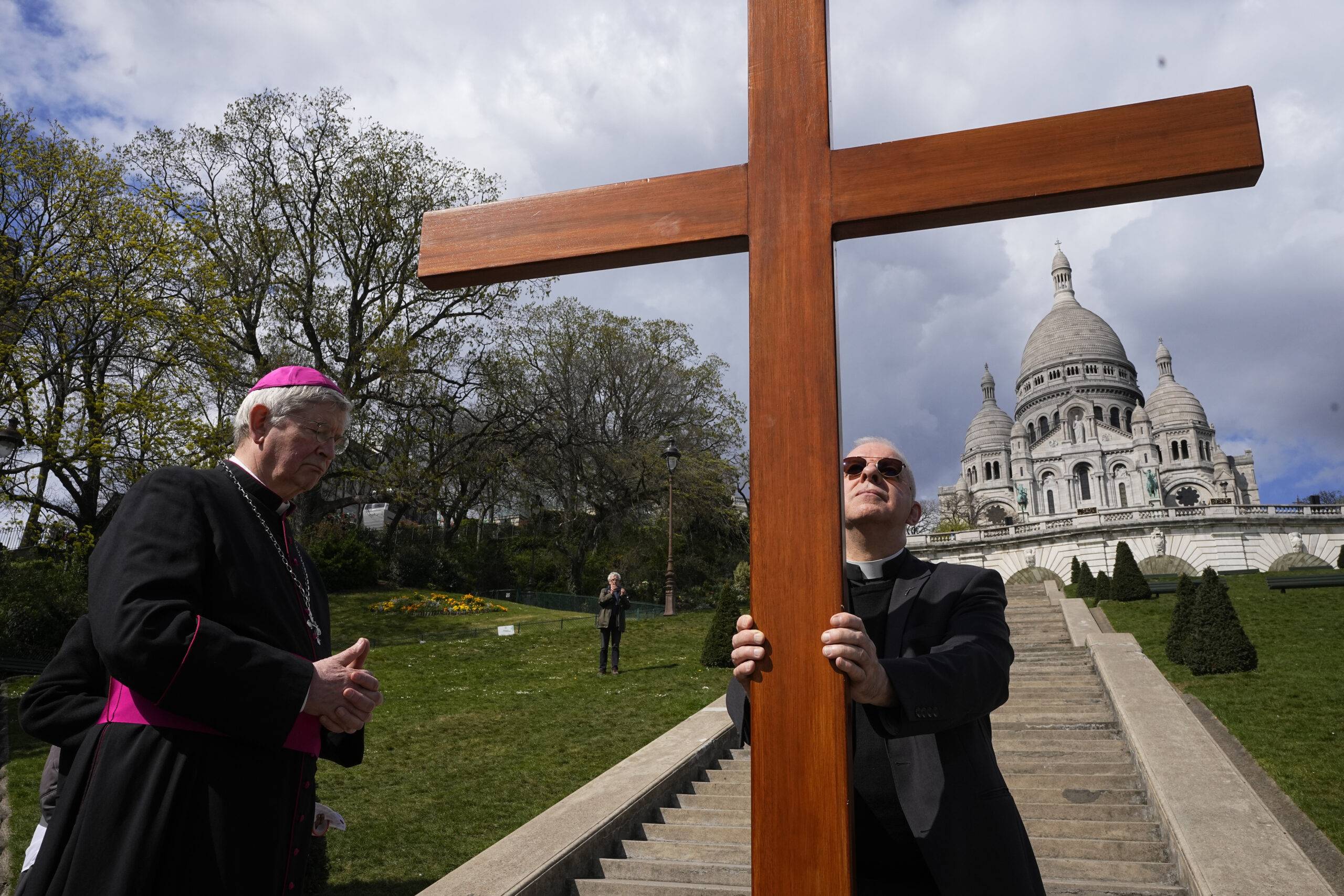 Paris Archbishop Laurent Ulrich, left, prays by a wooden cross in front the Sacre-Coeur basilica during the Way of the Cross ceremony as part of Easter celebrations, Friday, April 7, 2023 in Paris. (AP Photo/Michel Euler)