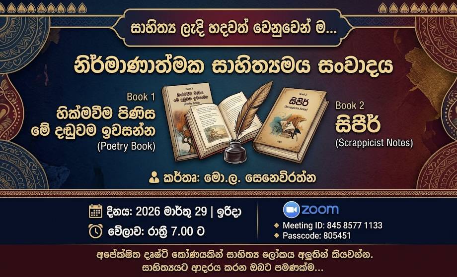 මාර්තු 29, LNW (කොළඹ): මො.ල. සෙනෙවිරත්න විසින් ලියන ලද “හික්මවීම පිණිස මේ දඬුවම ඉවසන්න” කාව්‍ය කෘතිය සහ “සිපීර්” ස්ක්‍රැපිසිවාදි සටහන් කෘතිය පිළිබඳ zoom සංවාදයක් 2026 මාර්තු මස 29 වැනිදා, ඉරිදා රාත්‍රී 7ට පැවැත්වේ!