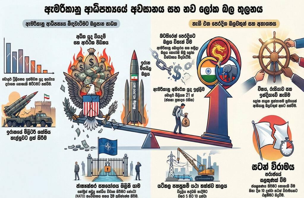 ”ඇමරිකාව සම්බාධක දැම්මත් යුදමය වශයෙන් ඔවුන් අසමත්. ඉරානයට චීනයේ සහ රුසියාවේ සහය ලැබුණා. බෝම්බ දාලා රෙජීම් චේන්ජ් කරන්න බැහැ. එහෙම දෙයකට ගොඩබිමෙන් යන ඕනේ. ඇමරිකන් හමුදාව ඉරාන ගොඩබිමට ගියොත් ඔවුන් සම්පුර්ණයෙන් විනාශයි. ඒක එච්චරම අමාරු භූමියක් බලකොටුවක් වගේ භූමියක්. ඇමරිකාවේ සුපිරි බලවත්භාවයට පැල්ලමක් එකතු වුණා. මේ විදිහටම බ්රිතාන්ය ඊජිප්තුවේ සූවස් ඇල පහර දීලා බලෙන් අල්ලගන්න ගියා. එකත් බැරුව ගියා. ඊට පස්සේ බ්රිතාන්යට තියෙන පිළිගැනීමට බලපැමක් ආවා. ඕනෑම ආණ්ඩුවක ජනාධිපති කියන්නේ බොරු නම් කියන දේ කරන්න බැරි නම් එයාට තියෙන ගෞරවය පිළිගැනීම නැතුව යනවා. ඒක ජනාධිපතිකෙනෙකුට වෙන්න පුළුවන් රටකට වෙන්න පුළුවන්. සුපිරි බලවතෙකුට වුණත් එකයි. දැන් ට්රම්ප් ගැන වුණත් මහජන විශ්වාසයක් නෑනේ. සාම සාකච්ජා පවත්වනවා ඒ අතරතුර ගහනවා. ඒක ලෝක නායකයෙකුගේ චරිතයට ගැළපෙන එකක් නෙවෙයි. චීනය ආර්ථික වශයෙන් මතුවෙනවා. රුසියාවේ මතුවෙනවා, ඉන්දියාවට උඩට එනවා. එයාල මේක පවත්වාගෙන යයි. මැදපෙරදිගින් ඇමරිකාවට යන්න වෙනවා. තෙල්වල තියෙන හෙජමොනිය නැතුව යනවා. එහෙම ගියාම සල්ලි නැතුව යනවා. ඇමරිකාවේ හමුදා කදවුරු ලෝකය පුරා 750ක් තියෙනවා. හමුදා කඳවුරු දාන ඒකෙන බලය එනවා වගේම අනිත් පැත්තේ පරිහානියත් එනවා. මිලිටරි එක්ස්පෙන්ෂන් කරන්න ගියාම ආර්ථිකය කඩන වැටෙනවා. ඕනෑම රටක GDP ඒකෙන 15%ට වා ආරක්ෂාවට දැම්මොත් ඒ රට කඩන් වැටනවා. සෝවියට් රුසියාවට වුනෙත් එකයි. වර්ල්ඩ් ඔපිනියන් කියල එකක් තියෙනවා. වෙනිසියුලාවට කරපු වැඩේට කැමති නැහැ. නිකන් හිටපු ඉරානයට නේ ගැහුවේ ලෝක මතය තුළ ඒවාට කැමැත්තක් නැහැ. ”