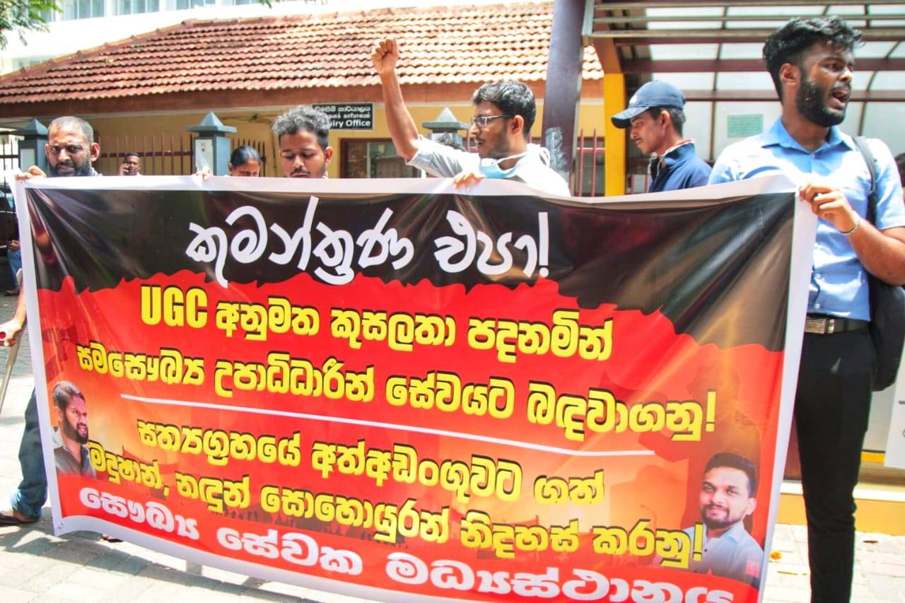 පසුගියදා සෞඛ්ය අමාත්යාංශය ඉදිරිපිට සත්යග්රහයේදී අත්අඩංගුවට ගැනුණු අන්තර් විශ්ව විද්යාලීය ශිෂ්ය බල මණ්ඩලයේ කැඳවුම්කරු මදුෂාන් චන්ද්රජිත් සහ නදුන් නිදහස් කරන ලෙසත් විශ්ව විද්යාල ප්රතිපාදන කොමිසම විසින් අනුමත කුසලතා මත සමසෞඛ්ය උපාධිධාරීන් සේවයට බඳවා ගන්න ලෙසත් එහිදී බලකෙරුණි.