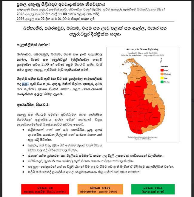 විශේෂයෙන්ම දිවයිනේ බස්නාහිර, සබරගමුව සහ මධ්‍යම ඇතුළු පළාත් කිහිපයකට සවස් කාලයේදී ප්‍රබල අකුණු සහ ගිගුරුම් සහිත වැසි ඇතිවිය හැකි බව මෙහි සඳහන් වේ.