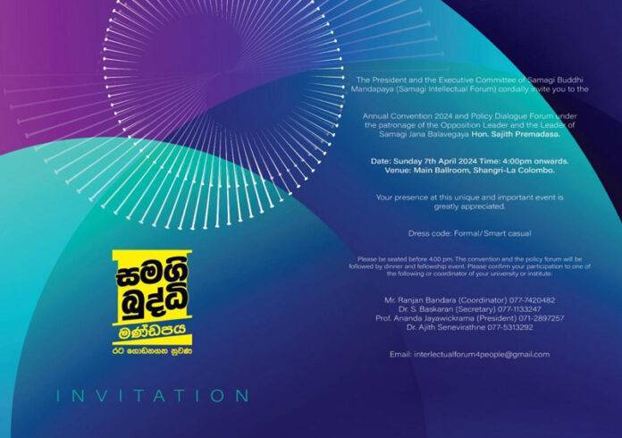 කොළඹ LNW:සමගි ජන බලවේගය යටතේ සන්ධාන ගත වී සිටින විශ්ව විද්යාල ඇදුරන්ගේ මුලිකත්වයෙන් යුතුව ආරම්භ කර ඇති “සමගි බුද්ධි මණ්ඩපයේ” පළමු වාර්ෂික සම්මේලනය කොළඹ “Shangri-La” හෝටලයේ දී අද (07) වැනිදා පස්වරු 4.00 ට පැවැත්වීමට නියමිතයි.