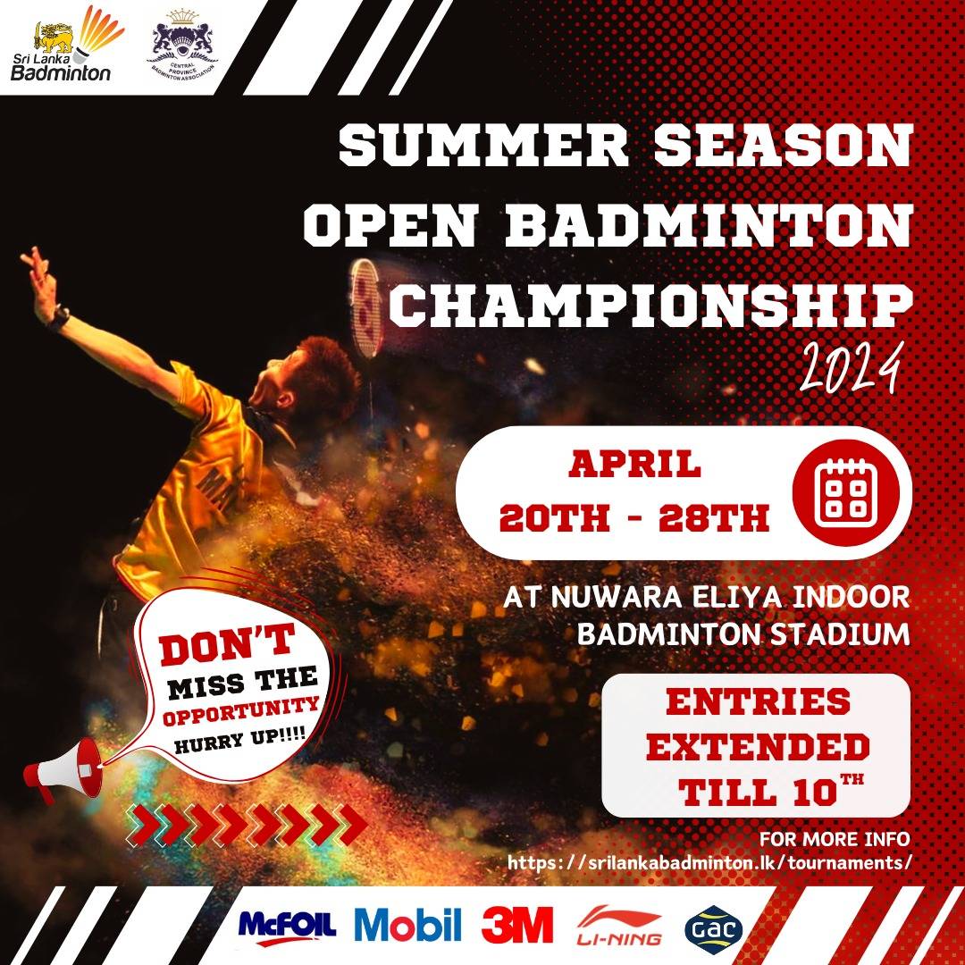 නුවරඑළිය ගෘහස්ත ක්රීඩාංගණයේ දී පැවත්වෙන මෙම තරගාවලිය සඳහා ඇතුළත්වීමට මේ වන විටත් ශ්රී ලංකාවේ ජාතික මට්ටමේ ක්රීඩක ක්රීඩිකාවන් විශාල පිරිසක් එක්ව සිටින අතර ශ්රී ලංකා බැඩිමින්ටන් හරහා මේ පිළිබඳව තොරතුරු දැන ගැනීමට ඔබට අවස්තාව ඇත.එසේම මේ දක්වා තරගාවලියට ඉදිරිපත් වී නැතිනම්,වසන්තයට ලස්සන වී ඇති නුවරඑළියේ හැඩත් සමඟ බැඩිමින්ටන් උණුස්මට දායක වන්න අප්රේල් 10 වන දා දක්වා සහභාගි වන්නන්ට අයදුම්පත් ඉදරිපත් කිරීමේ අවස්ථාව ඇත.
