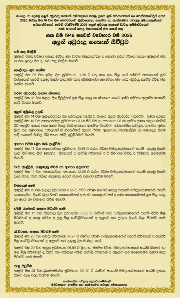 2026 අලුත් අවුරුදු නැකැත් සීට්ටුව