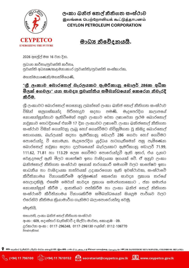 මෙම පුවත ප්රතික්ෂේප කරමින් තෙල් සංස්ථාව නිකුත් කළ සම්පූර්ණ නිවේදනය පහතින් දැක්වේ.