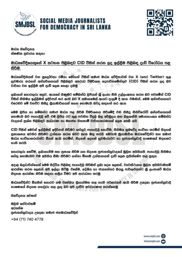 මාධ්යවේදියෙකුගේ X සටහන පිළිබඳව CID විසින් කරන ලද ඉල්ලීම පිළිබඳව ශ්රී ලංකාවේ ප්රජාතන්ත්රවාදය සඳහා සමාජ මාධ්ය මාධ්යවේදීන්ගේ එකතුව දැඩි විරෝධය ප්රකාශ කර ඇත.