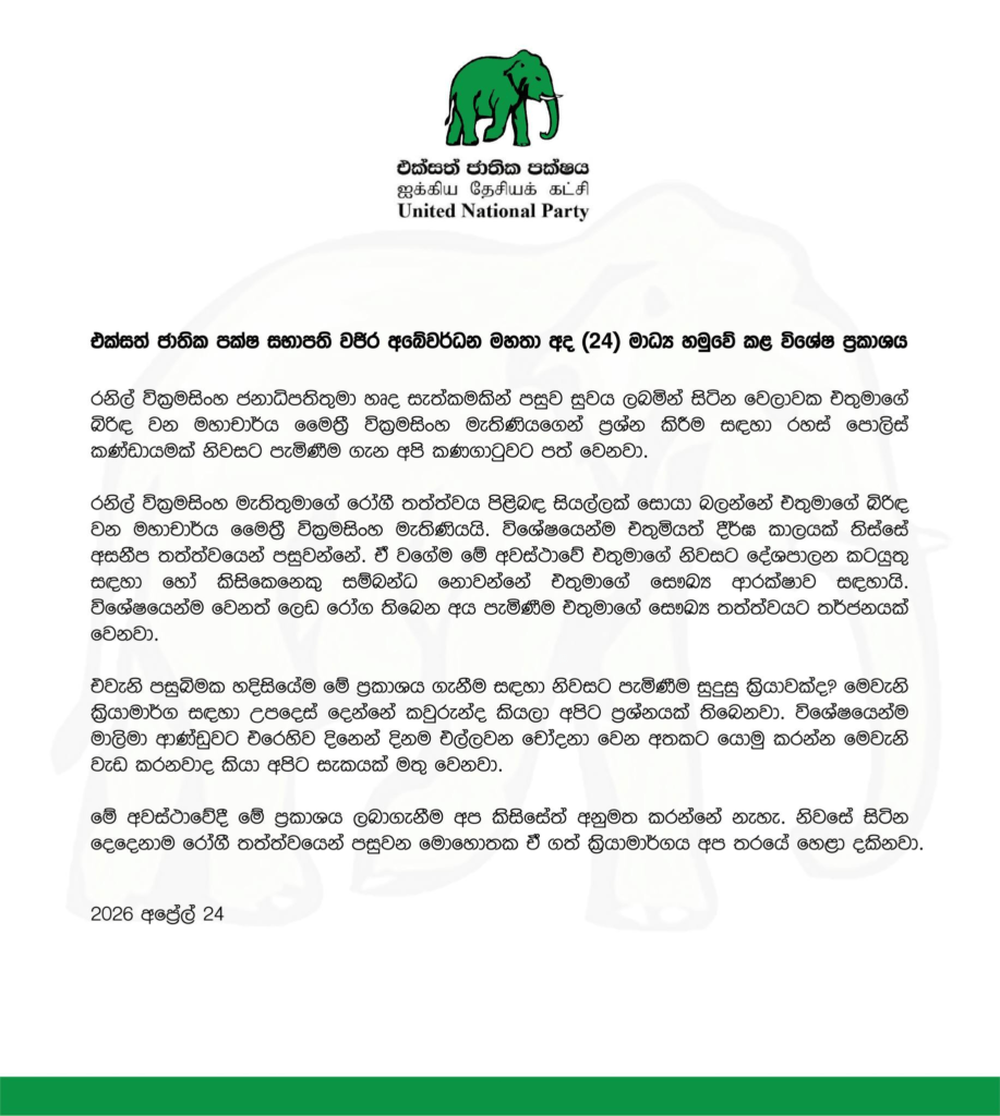 හිටපු ජනාධිපති, එක්සත් ජාතික පක්ෂ නායක රනිල් වික්රමසිංහ මහතා හෘද සැත්කමකින් පසුව සුවය ලබමින් සිටින මොහොතක ඒ මහතාගේ බිරිඳ වන මහාචාර්ය මෛත්රී වික්රමසිංහ මහත්මියගෙන් ප්රශ්න කිරීම සඳහා රහස් පොලිස් කණ්ඩායමක් ඔවුන්ගේ නිවසට යාම තරයේ හෙළාදකින බව එක්සත් ජාතික පක්ෂ සභාපති වජිර අබේවර්ධන මහතා පවසයි.