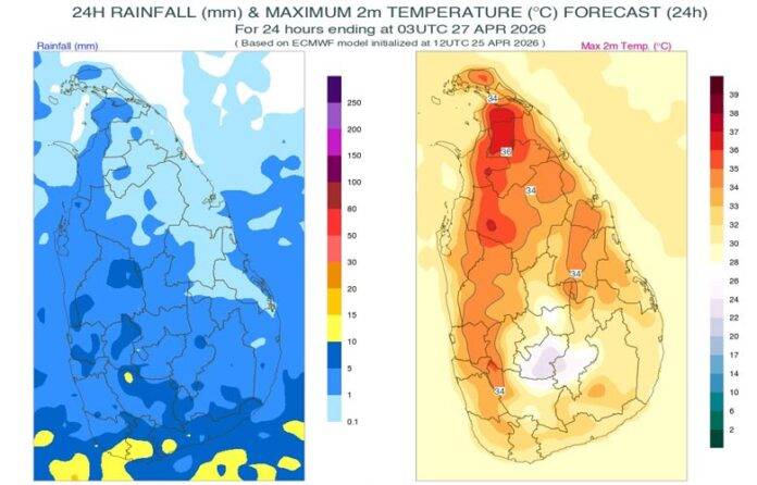 අද (අප්‍රේල් 26) දිනයේදී බස්නාහිර, සබරගමුව සහ වයඹ පළාත්වලත් ගාල්ල, මාතර, මහනුවර සහ නුවරඑළිය දිස්ත්‍රික්කවලත් ප. ව. 2.00 න් පසු තැනින් තැන වැසි හෝ ගිගුරුම් සහිත වැසි ඇතිවන බව කාලගුණ විද්‍යා දෙපාර්තමේන්තුව පවසයි.