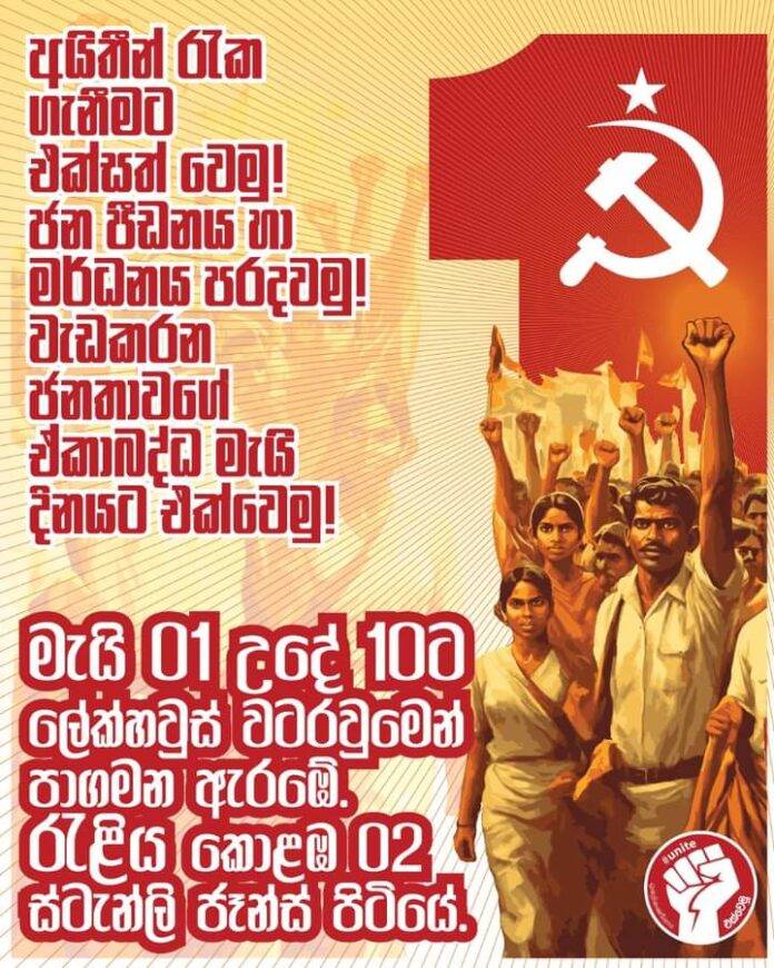 මෙම මැයි දිනයේදී, ස්ත්‍රී පුරුෂ භාවය, ජාතිය සහ කුලය යනාදී සකලවිධ අනන්‍යතාවන් හේතුවෙන් අප අතර පවතින අසමානතා අනුදැක ඊට එරෙහිව සටන් කිරීමට ප්‍රතිඥා දෙමින් අපි එක් වෙමු. වැඩකරන ජනතාව අත්හැර දමා ඇති ගෝලීය පාලනාධිකාරියටත්,