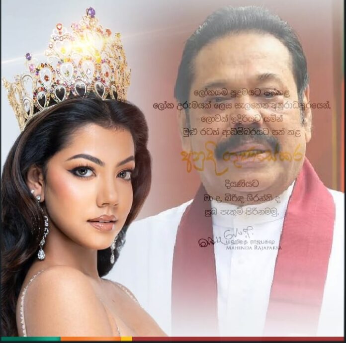 හිටපු ජනපති මහින්ද රාජපක්ෂ මහතා තම නිළ ෆේස්බුක් ගිණුමේ සටහනක් තබමින් ,72 වැනි ලෝක රූ රැජන තේරීමේ තරගාවලියට ශ්‍රී ලංකාව නියෝජනය කරමින් ඉදිරිපත් වී සිටින අනුදි ගුණසේකරට සුබ පැතුම් එක්කර තිබේ.