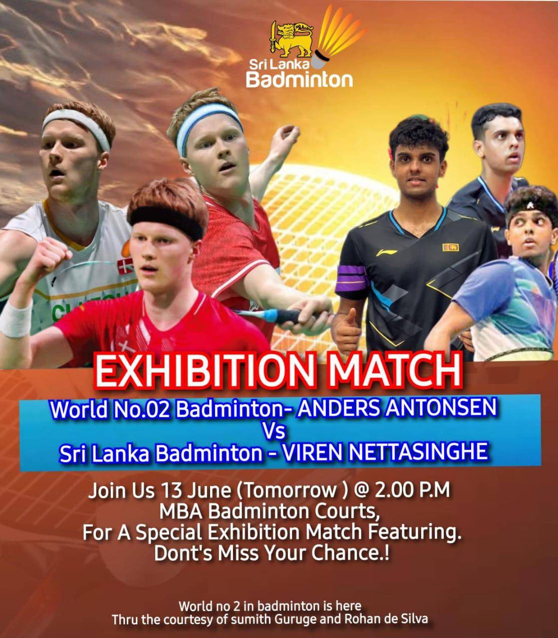 ලොව අංක දෙකට ශ්‍රේණිගතව සිටින බැඩ්මින්ටන් ක්‍රීඩකයා වන ඇන්ඩර්ස් ඇන්ටොන්සන් සශ ශ්‍රී ලංකාවේ අංක එකේ බැඩිමින්ටන් ක්‍රීඩකයා වන විරේන් නෙත්තදිංහ අතර ප්‍රදර්ශනාත්මක තරගයක් ජූනි 13 වන දා පස්වරු 2.00 ට වෙළඳ සේවා බැඩ්මින්ටන් ගෘහස්ත ක්‍රීඩාංගණයේදී පැවත්වීමට කටයුතු කර ඇත.ශ්‍රී ලංකා බැඩ්මින්ටන් සහ සිලෝන් මාස්ටර්ස් බැඩ්මින්ටන් සංවිධානය කරන මෙම ජාත්‍යන්තර සුහද බැඩිමින්ටන් තරගය ශ්‍රී ලංකාවේ බැඩිමින්ටන් ක්‍රීඩා ලෝලීන්ට හිමිවන දුර්ලභ අවස්ථාවක් ලෙස හැඳින්විය හැකිය.