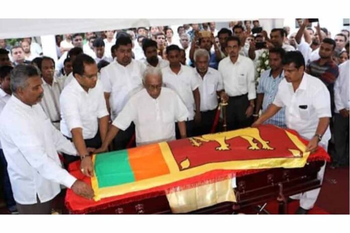 මේ ඔහුට උරුම පරිදි උතුරේ ගම් බිම් වෙත කඩාවැදි හමුදාවන් විසින් ඔසවාගෙන ගිය සිංහ කොඩියෙන් ඔහුගේ දෙන (මෘතදේහ පෙට්ටිය) නූතන සිංහල බෞද්ධ ජාතිකවාදයේ න්‍යායික පියාවූ ගුණදාස අමරසේකර විසින් වසන ඡායාරූපයකි. ඊට යටින් යාන්තමට පෙනෙන්නේ වමේ රතු කොඩියයි.