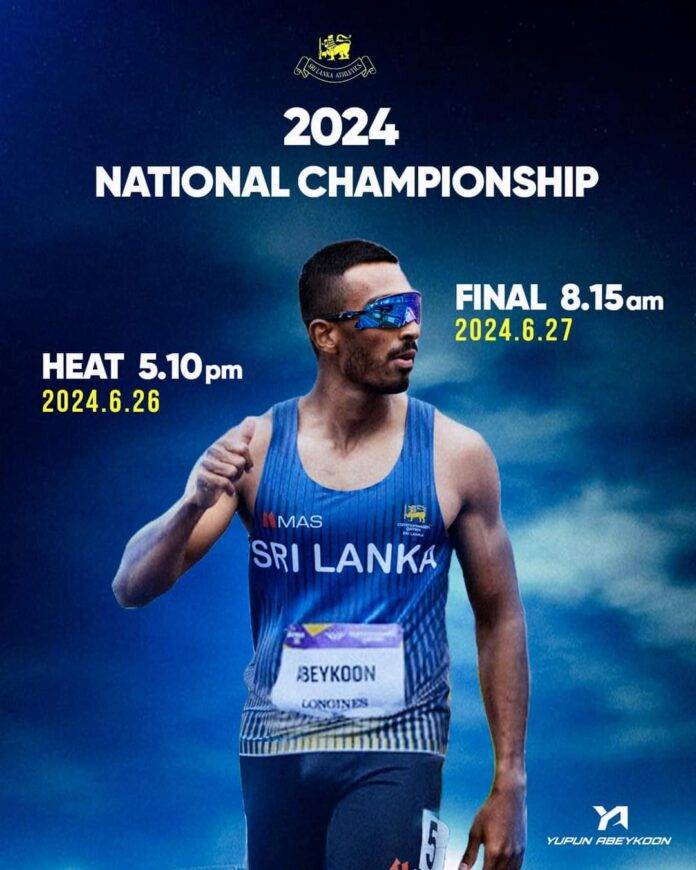 ඒ අනුව අද ඔලිම්පික් බලාපොරොත්තු අසළ ගැවසෙමින් සිටින යුපුන් අබේකෝන් මීටර් 100 මූලික තරගවලට සහභාගිවීමට නියමිත අතර ඔහු කලෙකට පසුව ශ්රී ලංකාවේදී තරග වැදීම සිඳුවීම වැදගත් කොට සිතිය හැකියි.හෙට යුපුන් මෙහි අවසන් තරගයට තරග වඳින අතර එය බොහෝ විට ශ්රී ලංකාවේ මීටර් 100 ඉසව්වක දුටු වේගවත්ම තරගය විය හැකියි.අද යුපුන්ගේ මූලික තරගය පස්වරු 5.10 ට පැවත්වෙන අතර අවසාන තරගය හෙට පෙරවරු 8.15 ට පැවත්වෙනවා ඇත.