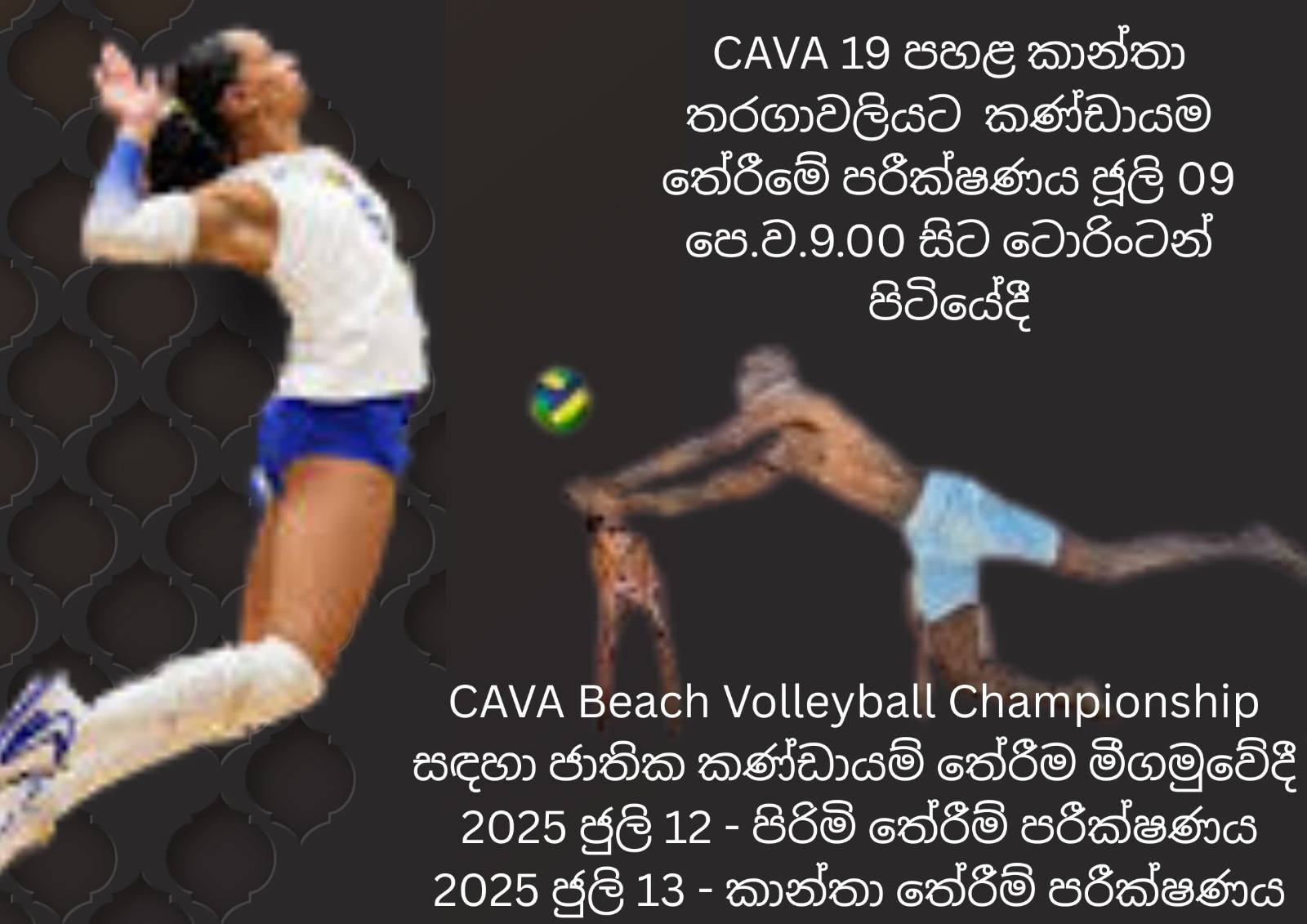 මධ්යම ආසියානු වොලිබෝල් සම්මේලනයේ ආරාධනයකට අනුව ශ්රී ලංකා වොලිබෝල් සම්මේලනය සංවිධානය කරනු ලබන CAVA U-19 Women Volleyball Championship 2025 වොලිබෝල් තරගාවලිය රටවල් 06 ක සහභාගීත්වයෙන් 2025 නොවැම්බර් මස 03 දින සිට 09 දින දක්වා සුගතදාස ගෘහස්ථ ක්රීඩාංගණය කේන්ද්ර කර ගනිමින් පැවැත්වීමට කටයුතු සුදානම් කර ඇති අතර ඒ සඳහා අවුරුදු 19න් පහළ බාලිකා කණ්ඩායමක් තෝරා ගැනීමටත්, 2025 අගෝස්තු 09 දින සිට 15 දින දක්වා මාල දිවයිනේ පැවැත්වීමට නියමිත CAVA Beach Volleyball Championship තරගාවලිය ඉලක්ක කර ගනිමින් ආරම්භ කිරීමට නියමිත ජ්යෙෂ්ඨ ජාතික පිරිමි කාන්තා බීච් වොලිබෝල් සංචිත සඳහා ක්රීඩක ක්රීඩිකාවන් තේරීමටත් තෝරා ගැනීමේ පරීක්ෂණ පැවත්වීමට ශ්රී ලංකා වොලිබෝල් සම්මේලනය තීරණය කර තිබෙනවා.