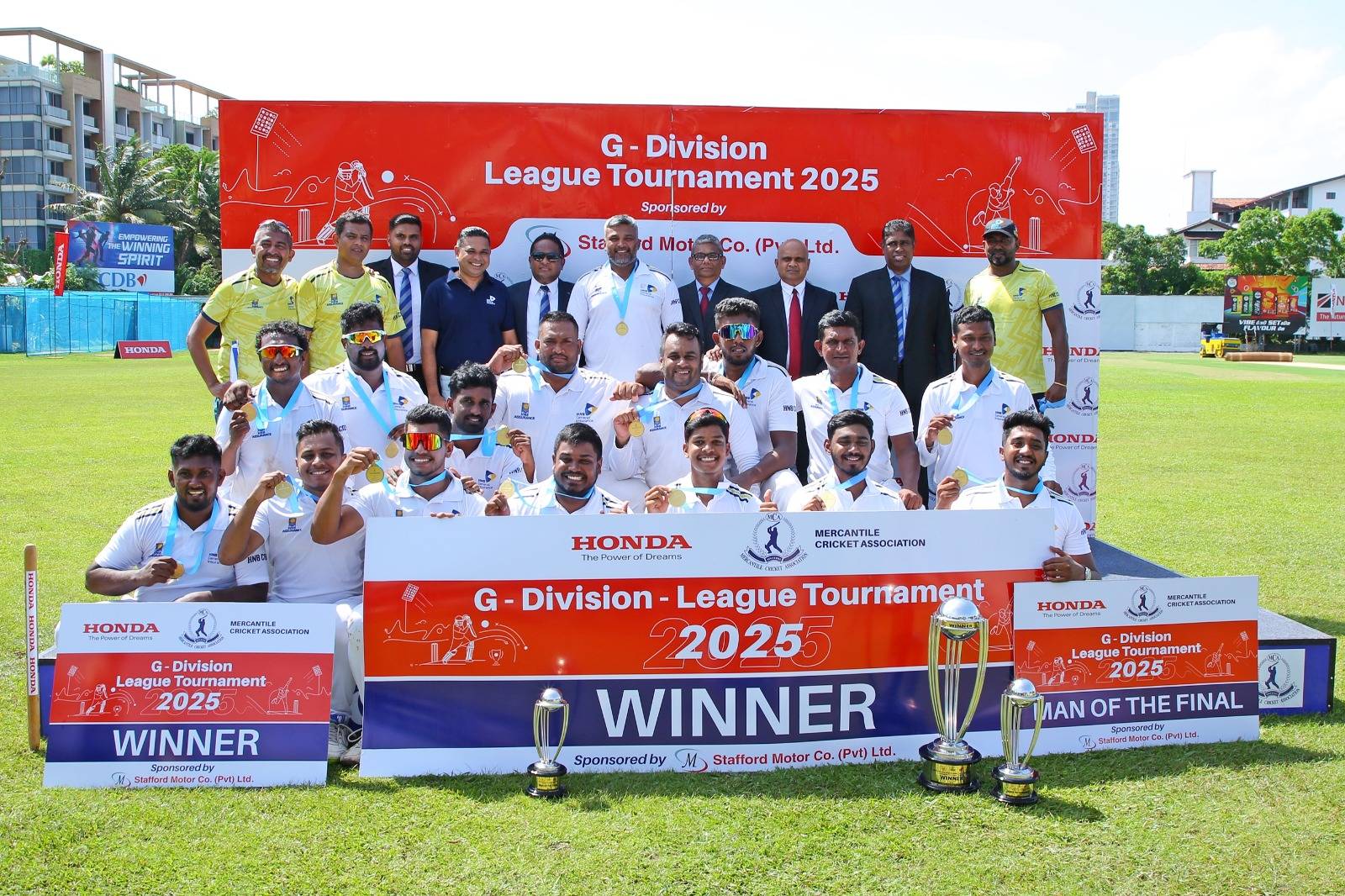 ස්ටැෆර්ඩ් මෝටර් සමාගමේ අනුග්රහයෙන් පැවති “හොන්ඩා” කුසලානය – MCA “G” 25 ඕවර් ඩිවිෂන් ලීග් තරඟාවලියේ 2025 අවසන් මහා තරඟයේදී Access සමූහය ලකුණු 152 කින් පරාජය කරමින්, HNB ඇෂුවරන්ස් සමූහය, ජුනි 21 වන දින MCA පිටියේදී ඔවුන්ගේ මංගල වෙළඳ සේවා ක්රිකට් ශූරතාව දිනා ගත්තේය.14 වන වරට පැවති මෙවර තරගාවලියේ අවසාන තරගයේදී HNB ඇෂුවරන්ස් ආරම්භක පිතිකරු දසුන් මධුරංග අබේවර්ධනගේ (පන්දු 58 කදී ලකුණු 118, හයේ පහර 13 ක් සහ හතරේ පහර 06 ක් ඇතුළුව) බලගතු ශතකයක් සහ ආරම්භක පන්දු යවන්නා වන චමිල කිත්මාල් වික්රමරත්නගේ (ඕවර 05, ලකුණු 08, කඩුලු 04) පන්දු යැවීමත් දුලාංගන ප්රභාත් විජේසිංහගේ නායකත්වයෙන් HNB ඇෂුවරන්ස් කණ්ඩායමට ජයග්රහණය උදා කරන්නට බෙහෙවින් දායක විය.