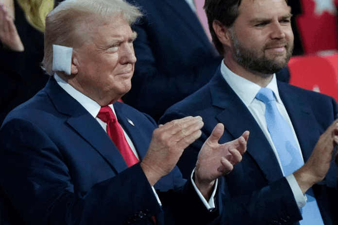 සභාවට පැමිණි ට්‍රම්ප් සිය උප ජනාධිපති අපේක්ෂක ඔහියෝ සෙනෙට් සභික ජේඩී වැන්ස් සමඟ අසුන්ගෙන සිට ඇති මුත් සභාවා අමතා නැත.