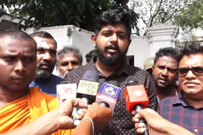 “මම සංඛ ජයසේකර. ගෝල්ෆේස් අරගල භූමිය නියෝජනය කරමින් අපි අද ආවෙ විපක්ෂ නායකතුමාව හම්බවෙන්න. අපෙ ගෝල්ෆේස්වල තිබ්බ එක අරමුණක් තමයි ගෝඨා රජය කියන ආණ්ඩුව පන්නන්න. දැන් ඒකෙ ඉතුරුවෙලා ඉන්නෙ රනිල් වික්රමසිංහ. ඒ වෙනුවෙන් විපක්ෂය කළයුතු කාර්යභාරයන් ගැන දැනුවත් කිරීම සහ ඉදිරියේදී පත්වෙන ඕනෙම ආණ්ඩුවක් අපි විසින් ඉදිරිපත් කරන ලද ඇක්ෂන් ප්ලෑන් එක අනුව ක්රියාත්මක විය යුතුයි කියන එක අවධාරණය කරන්න තමයි අපි ගෝල්ෆේස් අරගලකරුවන් විදියට මෙතැනට ආවෙ”