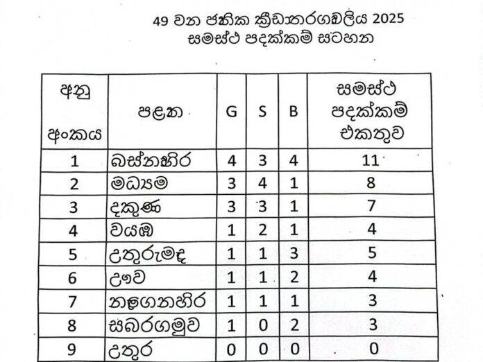ජූලි 29, කොළඹ LNW: මේ වන විට ක්රියාත්මක 49 වන ජාතික ක්රීඩා උළෙලේ රන් පදක්කම් 15 ක් බෙදී ගොස් අවසන්ය.සුපුරුදු පරිදි මෙවරත් බස්නාහිර පළාතම ජය ගැනීමට ඉඩ ඇති බවට ඉඟි සපයමින් එයින් රන් පදක්කම් 4 ක් සහිතව පෙරමුණ ගන්නට බස්නාහිර පළාත සමත්ව සිටියි. දෙවන තැන සිටින්නේ මධ්යම පළාතය.ඔවුන්ට රන් පදක්කම් 3 ක් හිමිව ඇත.මේ සමඟ තරගාවලියේ පදක්කම් සටහන දක්වා ඇති අතර ඉදිරියේදී ද මේ ආකාරයටම පදක්කම් සටහන දිගු වීමට ඇති ඉඩ විශාලය.