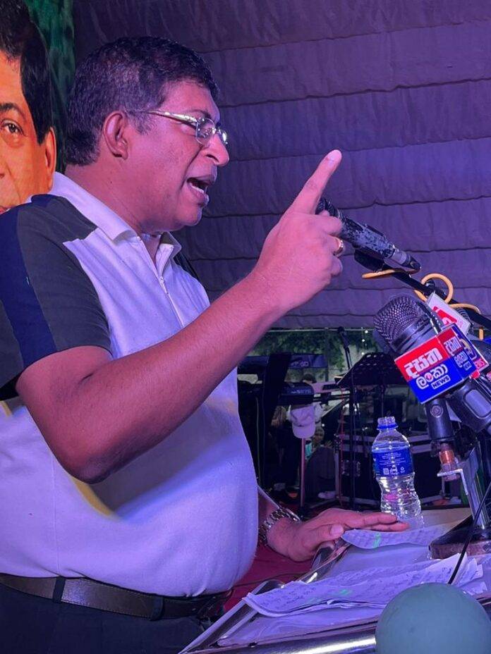 අපි නැගී සිටින්න ඕනෑ. මං කිවුවා වගේ මේ රට හදන්න බැරි එක නෙවෙයි හදන්න ඕන කමක් තියනවද නැද්ද කියන එක තමයි ප්රශ්නය. රනිල් වික්රමසිංහ භාර ගත්තේ බංකොලොත් රටක්. ඔහු පාර්ලිමේන්තුව හරහා ජනාධිපති වෙන්නේ එක්සත් ජාතික පක්ෂයෙන් නොවෙයි. ඒක අපි පිළිගන්න ඕනේ. අගය කරන්න ඕන. අනික් පක්ෂ එතුමාව විශ්වාස කරලා ඡන්දය දුන් නිසා අද රට හරි මාර්ගයේ යනවා නේද..? අද ඒ තනි අලියට පුළුවන් වෙලා තියනවා රට හරි මාර්ගයේ ගෙන යන්න. එක අලියෙක්ට මේ තරම් දෙයක් කරන්න පුළුවන් නම් අපි වගේ අනිත් අලි ටිකත් හිටියා නම් පෙරහැර ඉක්මනට යනවා නේද..?
