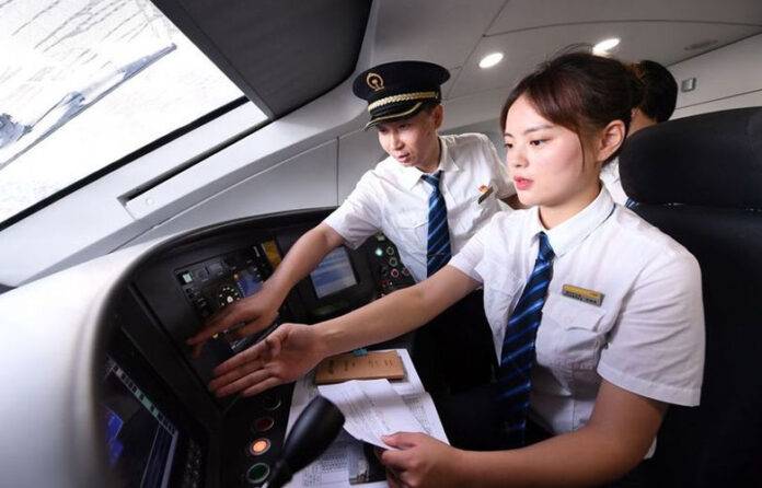 (මේ ඡායාරූපයේ ඉන්නෙ චීනයේ බුලට් ට්රේන් එකක් ඇතුලේ ගැහැණු දුම්රිය රියදුරෙක්).