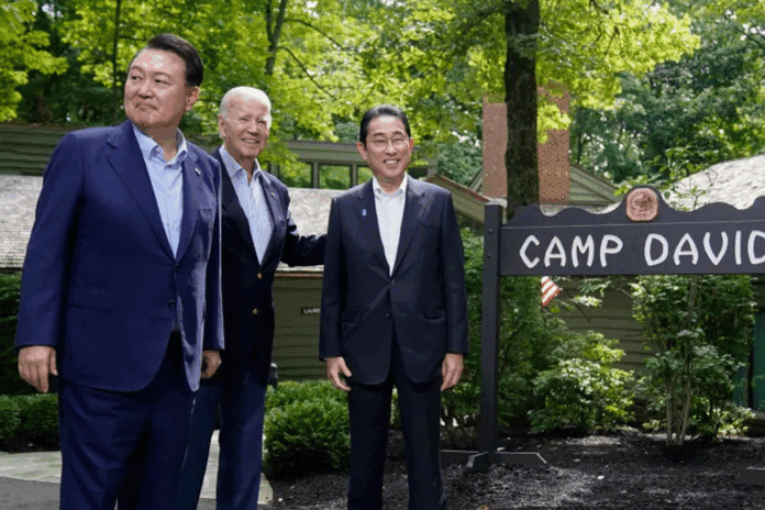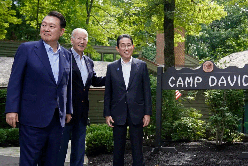 එක්සත් ජනපද ජනාධිපති ජෝ බයිඩන්, ඔහුගේ දකුණු කොරියානු සහකරු යූන් සුක්-යෙයෝල් සහ ජපාන අගමැති ෆුමියෝ කිෂිඩා ව්තර පළමු නිල හමුව ඊයේ(18) දිනයේදී කැම්ප් ඩේවිඩ්හිදී සිදු වූ අතර එහිදී ඒකාබද්ධ ප්රකාශයක් නිකුත් කරමින් නායකයන් තිදෙනා ත්රෛපාර්ශ්වික හවුල්කාරිත්වයේ නව යුගයක් ප්රකාශයට පත්කර තිබේ.