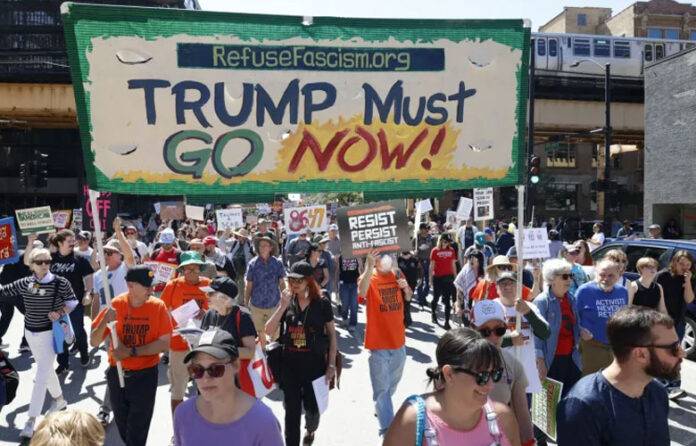 නිව්යෝර්ක්හි, ට්රම්ප් කුළුණෙන් පිටත රැස්ව සිටි සිය ගණනක් ජනයා ට්රම්ප් ඉල්ලා අස්වන ලෙස ඉල්ලා සිටිමින් ජනාධිපතිවරයා ෆැසිස්ට්වාදියෙකු ලෙස හඳුනවා තිබිණ.