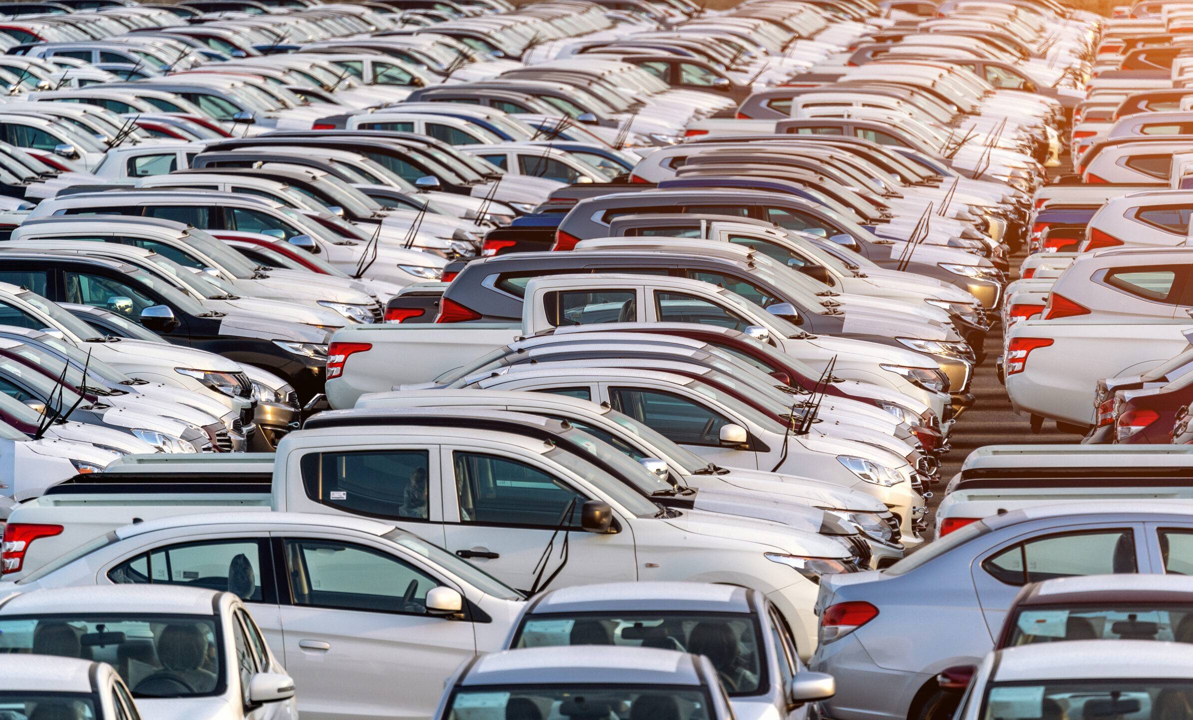 Row of new cars in port.