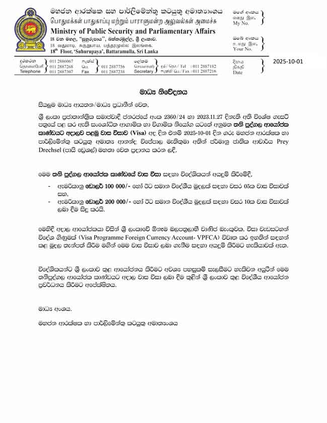 ඒ අනුව ඊයේ (01) දිනයේදී මහජන ආරක්ෂක හා පාර්ලිමේන්තු කටයුතු අමාත්‍ය ආනන්ද විජේපාල මහතා විසින් එම වීසා පත්‍රය ආචාර්ය පායි ඩ්‍රෙශල් මහතා වෙත පිරිනමා ඇත.