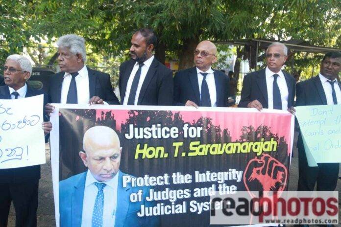 විනිසුරු T.සරවණරාජා මහතාට සාධාරණය ඉටුකරන ලෙස හා අධිකරණයේ ස්වාධිපත්‍යයට අත නොතබන ලෙස බලකරමින් අද(09) අලුත් කඩේ අධිකරණ සංකීර්ණය ඉදිරිපිට නීතිඥවරුන්ගේ සහභාගීත්වයෙන් විරෝධතාවක් සංවිධානය කර තිබුණි.