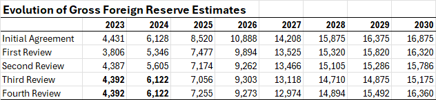 ඉන් පසුව පැවති තුන්වන හා හතරවන විමර්ශන වලදීද 2025 සිට ඉදිරි වසර සඳහා විදේශ සංචිත ඇස්තමේන්තු යාවත්කාලීන කෙරුණා. හතරවන විමර්ශනයේ 2025 වර්ෂාවසාන විදේශ සංචිත ප්රමාණය පිළිබඳ ඇස්තමේන්තුව තමයි ඩොලර් මිලියන 7,255 කියන්නේ. මෙය අරමුදලේ පැත්තෙන් ඇස්තමේන්තුවක් මිසක් අනිවාර්යයෙන් ලඟා කරගත යුතු ඉලක්කයක් නෙමෙයි. නමුත් ලංකාවේ පැත්තෙන් බලද්දී ලඟා කරගත්තානම් හොඳ ඉලක්කයක්. මුල්ම ඉලක්කය වූ ඩොලර් මිලියන 8,520 දක්වාම යන්න පුළුවන්කමක් තිබුණානම් තවත් හොඳයි. නමුත් දැන් ඒ ගැන කතා කරලාවත් වැඩක් නැහැනේ.