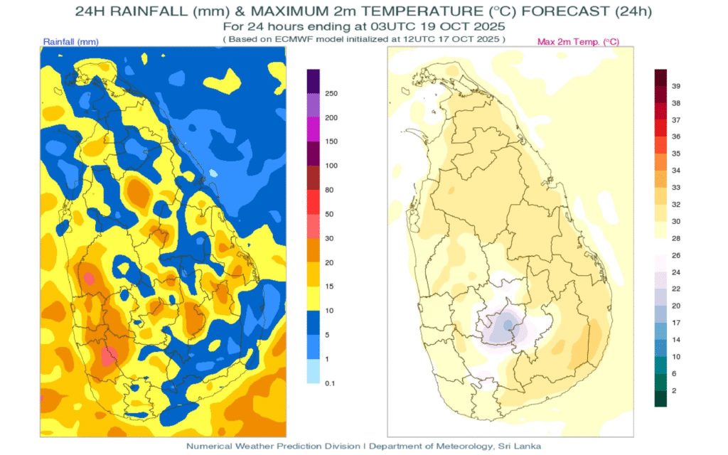අද (ඔක්තෝබර් 18) දිනයේදී දිවයිනේ බොහෝ ප්රදේශවල පස්වරු 1.00 න් පමණ පසුව වැසි හෝ ගිගුරුම් සහිත වැසි ඇතිවන බව කාලගුණ විද්යා දෙපාර්තමේන්තුව පවසයි.