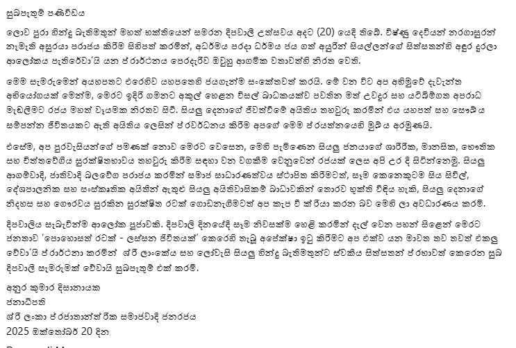 ‘පොහොසත් රටක් – ලස්සන ජීවිතයක්’ කෙරෙහි ජනතාව තැබූ අපේක්ෂාව ඉටු කිරීමට අප එක්ව යන මාවත දීපවාලි දිනයේ නිවෙස්වල දැල්වෙන පහන් සිළෙන් තව තවත් එකලු වේවායි ජනාධිපති අනුර කුමාර දිසානායක මහතා සිය දීපවාලි දින පණිවිඩයෙන් කියා තිබේ.