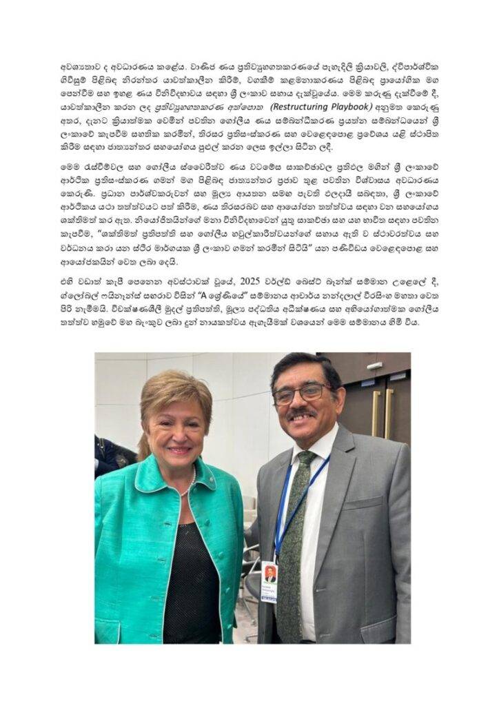 2025 වසරේ ඔක්තෝබර් මස 13 සිට 18 වන දින දක්වා වොෂින්ටන් ඩී. සී. හි පැවති ලෝක බැංකු සමූහයේ/ජාත්යන්තර මූල්ය අරමුදලේ 2025 වාර්ෂික රැස්වීම් අතරතුර දී ඉහළ මට්ටමේ ද්විපාර්ශ්වික සහ බහුපාර්ශ්වික සාකච්ඡා මාලාවකට සක්රීයව සම්බන්ධ විය. එම සාකච්ඡා වල දී මහ බැංකු අධිපති ආචාර්ය නන්දලාල් වීරසිංහ මහතා, ජාත්යන්තර මූල්ය අරමුදලේ කළමනාකාර අධ්යක්ෂවරිය, ලෝක බැංකු සමූහයේ සභාපති, ආයතන ද්විත්වයේම ඉහළ පෙළේ නිලධාරීන් සහ එක්සත් ජනපද භාණ්ඩාගාර දෙපාර්තමේන්තුවේ නියෝජිතයින් හමු විය. එහි දී ශ්රී ලංකා මහ බැංකුවේ සහ මුදල් අමාත්යංශයේ ජ්යේෂ්ඨ නිලධාරීන්ගෙන් සමන්විත වූ නියෝජිත පිරිස වෙත ශ්රී ලංකාවේ මේ වන විට ක්රියාත්මක වෙමින් පවතින ආර්ථික ප්රතිසංස්කරණ ප්රයත්න සඳහා ඉහළ සහයෝගයක් පළ විය.