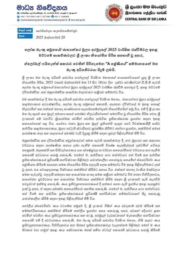 මේ සම්බන්ධයෙන් ශ්රී ලංකා මහ බැංකුව නිකුත් කල නිවේදනය පහතින් දැක්වේ.