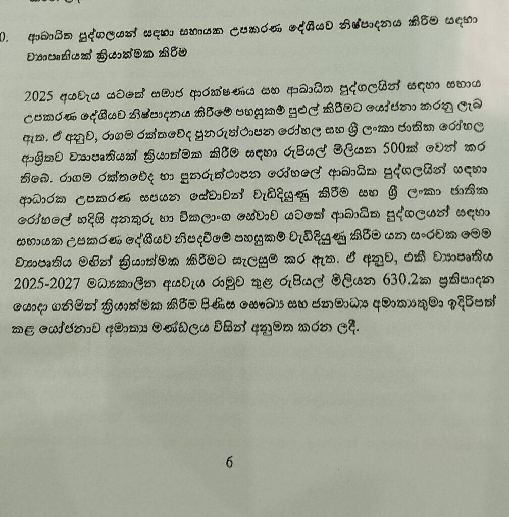 2025 අයවැය යටතේ සමාජ ආරක්ෂණය සහ ආබාධිත පුද්ගලයින් සඳහා සහාය උපකරණ දේශීයව නිශ්පාදනය කිරීමේ පහසුකම් පුළුල් කිරීමට යෝජනා කරනු ලැබ ඇත. ඒ අනුව ,රාගම රක්තවේද පුනරුත්ථාපන රෝහල සහ ශ්‍රී ලංකා රෝහල ආශ්‍රිතව ව්‍යාපෘතියක් ක්‍රියාත්මක කිරීම සඳහා රුපියල් මිලි. 500ක් වෙන් කර තිබේ.