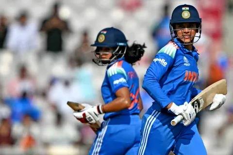 ප්‍රතිකා පවෙල් පන්දු 134 දී ලකුණු 122 ක් රැස් කළාය.ලකුණු 109 ක් ලැබූ ස්ම්‍රිති මන්දනා ප්‍රතිකාට වඩා වේගවත් විය.ඇයගේ ලකුණු 109 පැමිණියේ පන්දු 95 දී ය.ලකුණු සොයමින් සිටි ඉන්දීය පිතිකාරිණිය ජෙමීමා රොඩ්‍රිගස් නිදි ගැට බිඳ අවදි විය.පන්දු 55 දී නොදැවී ලකුණු 76 ක් ලබමින් ඇය ඉන්දීය ඉණිමේ පසුභාගය ශක්තිමත් කළාය.මේ තිදෙනාගේ දායකත්වය මත වර්ෂාව විසින් පන්දු ඕවර් 49 ක් දක්වා දිග අඩු කළ තරගයේ ඉන්දීය ඉණිම නිමාවන විට ලකුණු පූවරුව කඩුලු 3 ට ලකුණු 340 ක් ව තිබිණ.