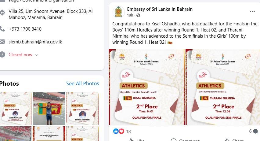 ශ්‍රී ලංකාව ඇතැම් ජාත්‍යන්තර තරගවලට සහභාගි වන විට එම රටේ සිටින ලාංකිකයන් දැනුවත් කිරීමක් සිඳුවන්නේ නැති බවට බොහෝ තොරතුරු වාර්තා වෙයි.ඒ නිසාම එම රටවල සිටින ලාංකිකයන් දැනුවත් කිරීමක් ද සිඳුවන්නේ නැත.එහෙත් මේ මොහොතේ ක්‍රියාත්මක ආසියානු යොවුන් ක්‍රීඩා තරගාවලිය පැවත්වෙන බහරේනයේ පිහිටි තානාපති කාර්යාලීය ෆෙස්බුක් ගිණුම මඟින් තරගාවලියේ ශ්‍රී ලංකා සහභාගීත්වය ගැන මෙන්ම ශ්‍රී ලංකාවේ ජයග්‍රහණ ගැන ද නිරන්තරයෙන් වාර්තා කරනු දැක ගැනීමට හැකිය.