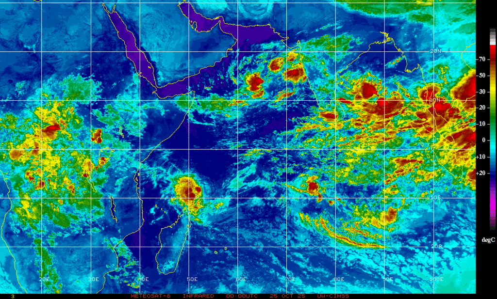ශ්‍රී ලංකාවට ඊසාන දෙසින්, ගිනිකොණ දිග බෙංගාල බොක්ක මුහුදු ප්‍රදේශයේ පවතින අඩු පීඩන කලාපය තවදුරටත් වර්ධනය වෙමින් බස්නාහිරට බරව වයඹ දිශාවට ගමන් කරනු ඇත. මෙම පද්ධතිය 2025 ඔක්තෝම්බර් 25 වැනි දින පෙ.ව. 5.00 ට පමණ මඩකලපුවේ සිට කිලෝමීටර් 850 ක් පමණ දුරින් පිහිටා තිබුණි. මෙම අඩු පීඩන කලාපය අද (25) දිනයේදී ගිනිකොණ දිග සහ ඊට යාබද මධ්‍යම-බෙංගාල බොක්ක මුහුදු ප්‍රදේශයේදී පීඩන අවපාතයක් දක්වා වර්ධනය වනු ඇත. මෙම පද්ධතිය ඔක්තෝම්බර් 26 දින ගැඹුරු පීඩන අවපාතයක් දක්වා සහ ඔක්තෝම්බර් 27 වන දින සුළිකුණාටුවක් දක්වා තව දුරටත් වර්ධනය වනු ඇතැයි අපේක්ෂා කරන බවයි කාලගුණ විද්‍යා දෙපාර්තමේන්තුව වැඩිදුරටත් සඳහන් කරන්නේ.