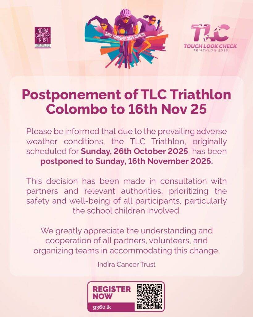 තවත් ඉතිරිව ඇත්තේ, ඔක්තෝබර් 26 – කොළඹ (බටහිර) වැඩසටහන පමණි. නමුත් පවතින අධික වර්ෂාපතනය හමුවේ එම වැඩසටහන නොවැම්බර් 16 (16th Nov 2025) දිනට කල් දමා ඇති බව ICT ට්රයැත්ලෝත් 2025 සංවිධායක කමිටුව නිවේදනයක් නිකුත් කරමින් දන්වා සිටී. එයද සාර්ථක එදිනට නිම කිරීම ඔවුන්ගේ බලාපොරොත්තුව වේ.