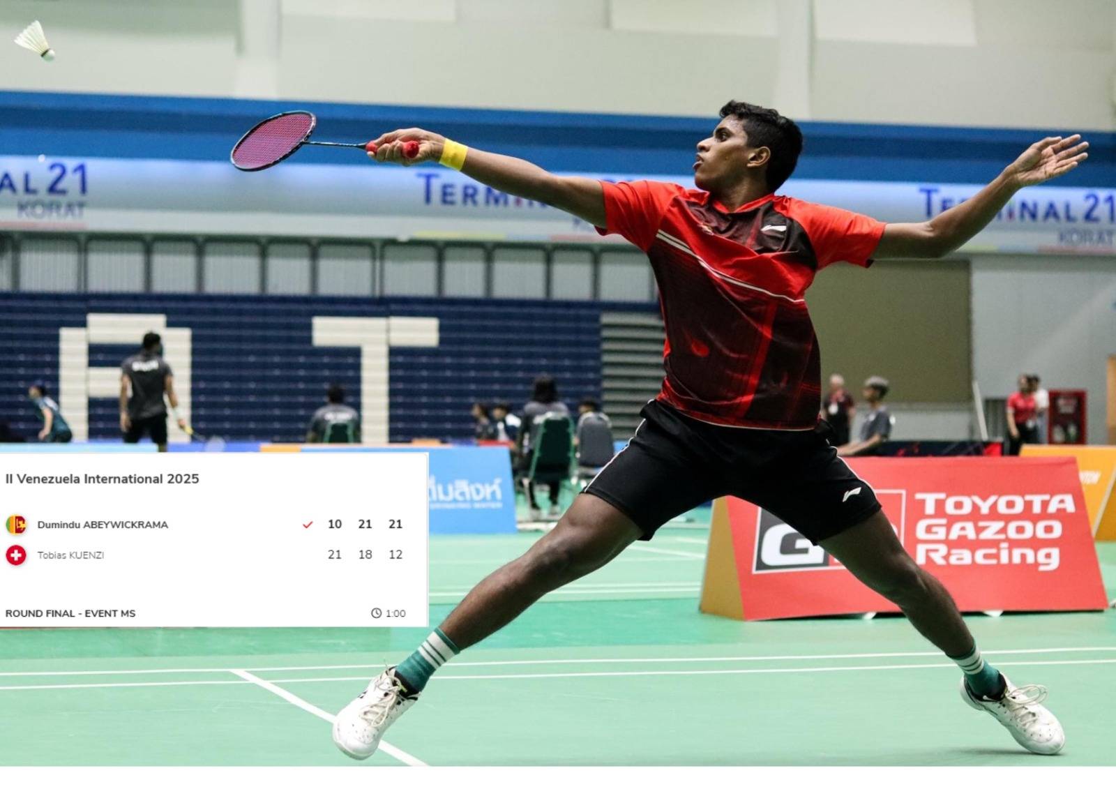 මෙම ජයග්‍රහණය සඳහා ඔහු අවසාන තරගයේදී පැයක පමණ කාලයක් වෙහෙස වූ අතර ඔහු අතින් පරාජයට පත් වූයේ ලෝකයේ wංක 153 ට සිටින ස්විට්ස්ර්ලන්තයේ ටොබියාස් කුවෙන්සි යි.තරගය වට 2-1 ක් ලෙස පැයක කාලයක් ඇදුණ වෙහෙසකර එකක් වූ අතර දුමිදු පළමු වටය 10 – 21 ත් ලෙස පරාජයට පත් වුණත් දෙවන වටය සහ තෙවන වටය පිළිවෙලින් 21 – 18 සහ 21 -12 ක් ලෙස ජය ගැනීමට සමත් වුණා.