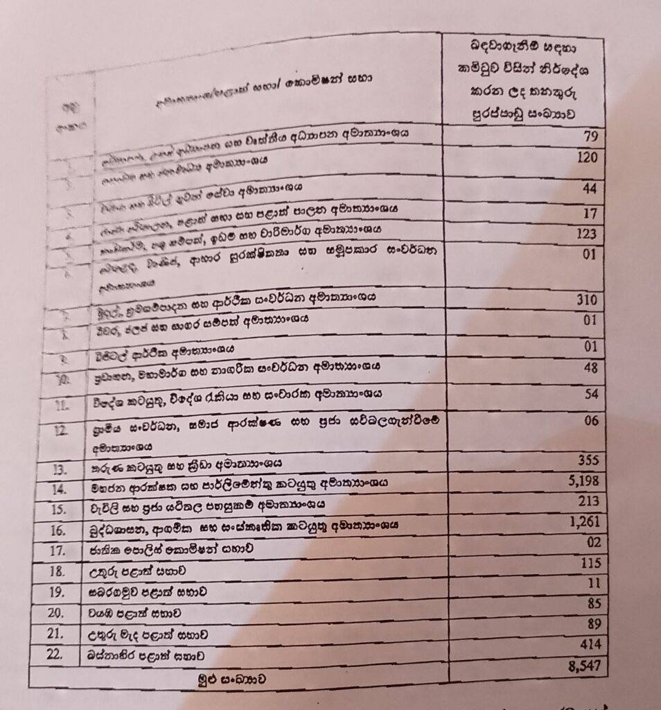 ඒ අනුව ඒ ඒ අමාත්‍යාංශ විසින් එම අමාත්‍යාංශ යටතේ පවතින දෙපාර්තමේන්තු සහ අනෙකුත් ආයතනවල පවතින තනතුරු පුරප්පාඩු සම්පූර්ණ කිරීම සඳහා ඉදිරිපත් කරන ලද ඉල්ලීම් සැලකිල්ලට ගෙන, ඔක්තෝබර් 02 වන දින පැවති අමාත්‍ය මණ්ඩල රැස්වීමේ දී කරනු ලැබ ඇති නිර්දේශ පරිදි පහත සඳහන් බඳවාගැනීම් සිදුකිරීම සඳහා අදාළ අමාත්‍යාංශ සහ ආයතන වෙත අනුමැතිය ලබාදී ඇත.