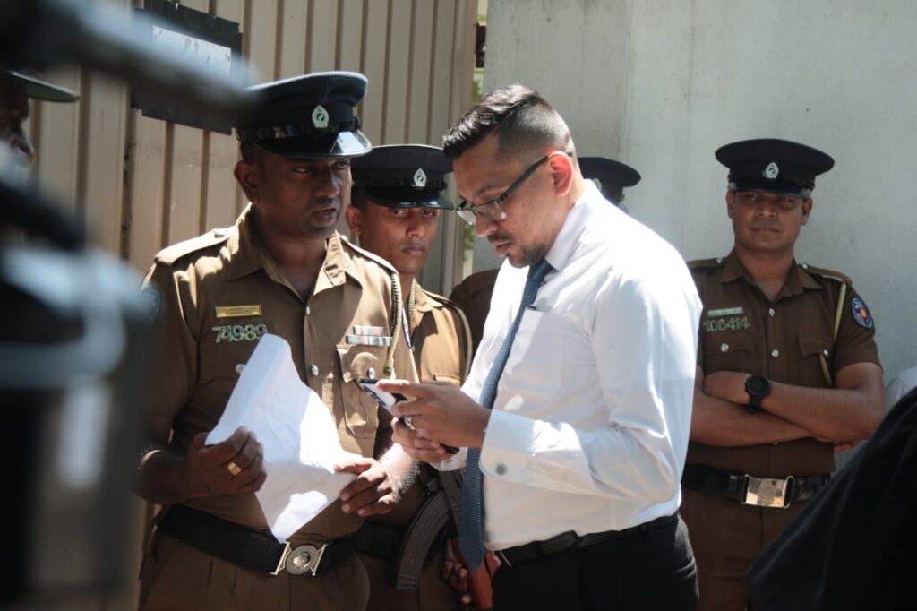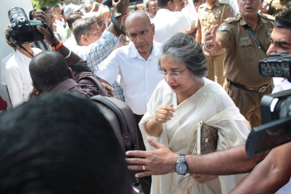 බිරිඳ මහාචාර්ය මෛත්‍රී වික්‍රමසිංහ මහත්මියද අධිකරණය වෙත පැමිණි අතර වික්‍රමසිංහ මහතාට සහය පළකරමින් පාක්ෂිකයින්ද අධිකරණ පරිශ්‍රය අසල රැඳී සිටියි.