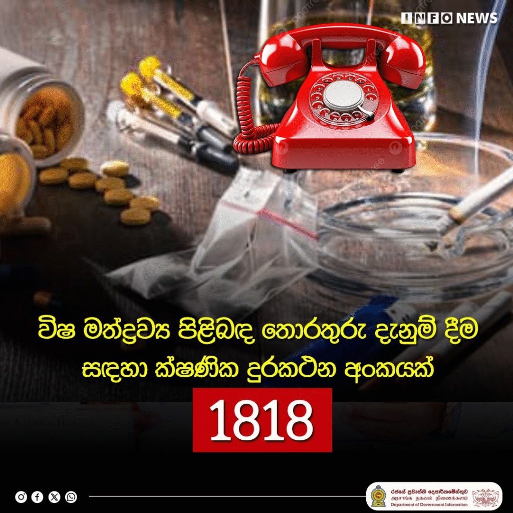 ‘රටම එකට’ ජාතික මෙහෙයුම් සභාවේ ඉල්ලීම මත හඳුන්වා දී ඇති “1818” ක්ෂණික ඇමතුම් දුරකථන අංකය ඔස්සේ මහජනතාවට, දිවයින පුරා මත්ද්රව්ය ජාවාරම්, බෙදාහැරීම් හෝ ඒ ආශ්රිත සැක කටයුතු ක්රියාකාරකම් පිළිබඳව නිවැරදි තොරතුරු ලබාදීමේ හැකියාව පවතින බවයි රජයේ ප්රවෘත්ති දෙපාර්තමේන්තුව සඳහන් කරන්නේ.